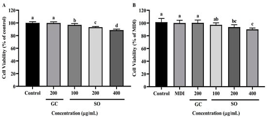 Effect of SO on cell viability of 3T3-L1 preadipocytes (A) and adipocytes (B). Values are expressed as mean ± SD of experiments (n = 3). Different alphabets indicate significant differences at the level of p < 0.05.