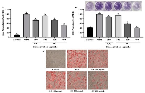 Effect of SO on lipid accumulation (A) and ROS production (B) in 3T3-L1 adipocytes. (C) Oil red O staining on day 8 of adipocyte differentiation. Values are expressed as mean ± SD of experiments (n = 3). Different alphabets indicate significant differences at the level of p < 0.05.