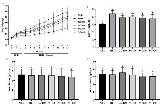 Effects of SO on body weight and diet in HFD-induced obese mice: (A) body weight change trend of mice during the experiment; (B) final body weight of mice at the end of the experiment; (C,D) food intake and water intake of mice during the experiment. GC200, HFD supplemented with 200 mg/kg/day of GC; SO100, HFD supplemented with 100 mg/kg/day of SO; SO200, HFD supplemented with 200 mg/kg/day of SO; SO400, HFD supplemented with 400 mg/kg/day of SO. Values are expressed as mean ± SD of experiments. Different letters indicate significant differences at the level of p < 0.05.