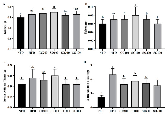 Effect of SO on organ weights in HFD-induced obese mice: (A) kidney weight; (B) spleen weight; (C) brown adipose tissue weight; and (D) white adipose tissue weight (visceral, epididymal, perirenal, retroperitoneal, and subcutaneous fat). GC200, HFD supplemented with 200 mg/kg/day of GC; SO100, HFD supplemented with 100 mg/kg/day of SO; SO200, HFD supplemented with 200 mg/kg/day of SO; SO400, HFD supplemented with 400 mg/kg/day of SO. Values are expressed as mean ± SD of experiments. Different letters indicate significant differences at the level of p < 0.05.