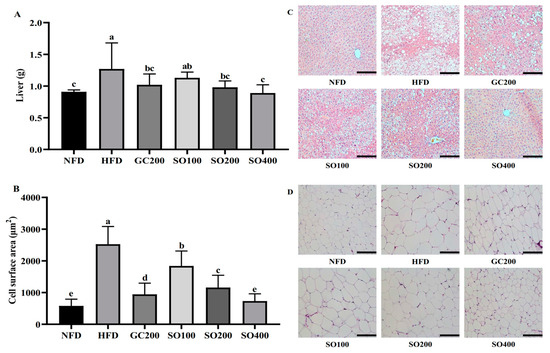 Effects of SO on hepatic steatosis and adipocyte hypertrophy in HFD-induced obese mice: (A) liver weight; (B) quantification of adipocyte area in white adipose tissue; (C) H&E staining of the liver; and (D) H&E staining of white adipose tissue. GC200, HFD supplemented with 200 mg/kg/day of GC; SO100, HFD supplemented with 100 mg/kg/day of SO; SO200, HFD supplemented with 200 mg/kg/day of SO; SO400, HFD supplemented with 400 mg/kg/day of SO. The scale bar represents a length of 50 μm. Values are expressed as mean ± SD of experiments. Different letters indicate significant differences at the level of p < 0.05.