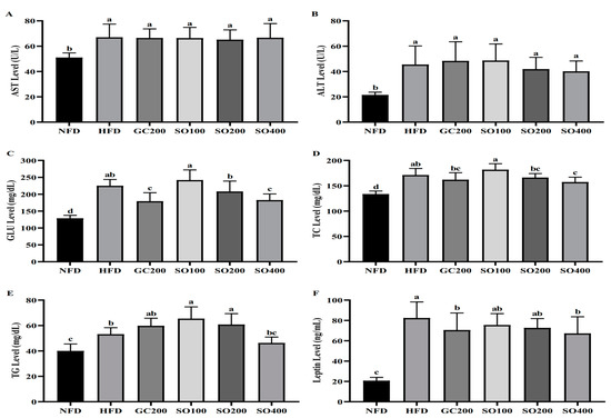Effects of SO on serum biochemical parameters in HFD-induced obese mice: (A) serum aspartate aminotransferase (AST) level; (B) serum alanine aminotransferase (ALT) level; (C) serum glucose level (GLU) level; (D) serum total cholesterol (TC) level; (E) serum triglyceride (TG) level; (F) serum leptin level. GC200, HFD supplemented with 200 mg/kg/day of GC; SO100, HFD supplemented with 100 mg/kg/day of SO; SO200, HFD supplemented with 200 mg/kg/day of SO; SO400, HFD supplemented with 400 mg/kg/day of SO. Values are expressed as mean ± SD of experiments. Different letters indicate significant differences at the level of p < 0.05.