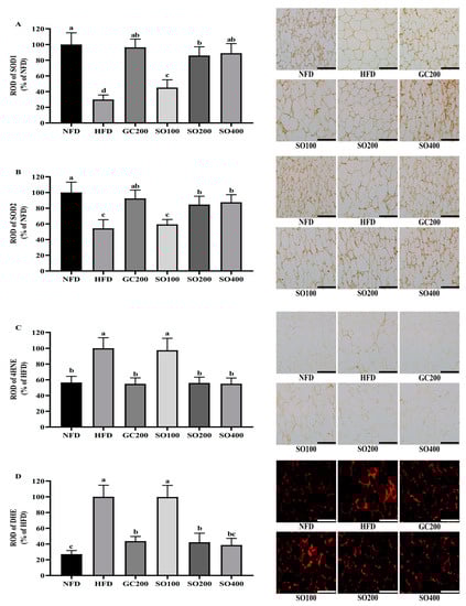 Effect of SO on oxidative stress in WAT of HFD-induced obese mice: (A,B) SOD1 and SOD2 expression measured by immunohistochemistry in WAT; (C) lipid peroxidation products determined by immunohistochemistry of 4HNE in WAT; (D) ROS production measured by histofluorescence staining of DHE in WAT. GC200, HFD supplemented with 200 mg/kg/day of GC; SO100, HFD supplemented with 100 mg/kg/day of SO; SO200, HFD supplemented with 200 mg/kg/day of SO; SO400, HFD supplemented with 400 mg/kg/day of SO. The scale bar represents a length of 50 μm. Values are expressed as mean ± SD of experiments. Different letters indicate significant differences at the level of p < 0.05.