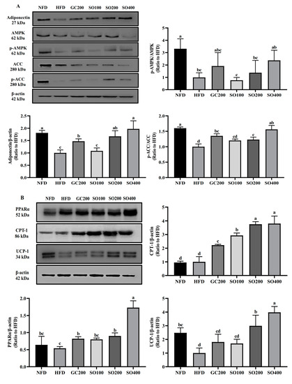 Effects of SO on energy metabolism and thermogenesis in WAT of HFD-induced obese mice: (A) adiponectin and AMPK pathways; (B) thermogenesis-related factors. GC200, HFD supplemented with 200 mg/kg/day of GC; SO100, HFD supplemented with 100 mg/kg/day of SO; SO200, HFD supplemented with 200 mg/kg/day of SO; SO400, HFD supplemented with 400 mg/kg/day of SO. Values are expressed as mean ± SD of experiments. Different letters indicate significant differences at the level of p < 0.05.