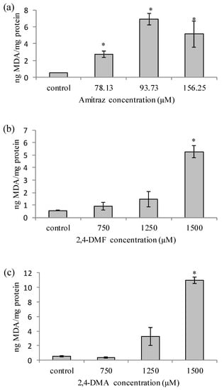 Lipid peroxidation production in HepG2 cells for (a) amitraz, (b). N-(2,4-Dimethylphenyl)formamide (2,4-DMF) and (c) 2,4-Dimethylaniline (2,4-DMA) after 24 h of exposure. Results are expressed as mean ± SEM (n = 3) in ng of Malondialdehyde (MDA)/mg of protein measured by Bradford method. (*) p ≤ 0.05 indicates significant differences from control.