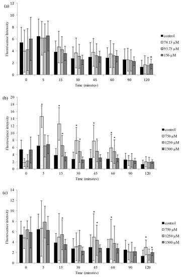 To evaluate the role of ROS production in pesticide-mediated cytotoxic effects in HepG2 cells, the production of the fluorescent DCF in response to different concentrations of amitraz and its two metabolites was analyzed. As observed in Figure 2a, no significant increase of ROS production was measured in HepG2 cells at the three concentrations of amitraz tested in the interval 0–90 min. However, a significant slight increase in ROS generation (1.02 folds of control) was observed at the highest concentration (156.25 µM) tested at 120 min with respect to the control. Regarding 2,4-DMF, the results showed an increase in ROS production at 750 and 1250 µM from 5 to 60 min (Figure 2b). The increase in ROS production ranged from 2.11- to 3.27-fold and from 1.66- to 1.77-fold with respect to control in HepG2 cells, respectively. As shown in Figure 2c, ROS generation after 2,4-DMA exposure was significant at the three concentrations tested at different time ranges. The highest fluorescence intensity (2.3-fold with respect to control) was observed at 750 µM after 120 min.