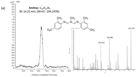 Instrument control and data acquisition were performed using Agilent MassHunter Workstation software B.08.00 (Agilent Technologies, Santa Clara, CA, USA). The identification of amitraz and its metabolites was verified by comparing the retention times of peaks in positive samples to those shown by analytical standards, setting a strict mass accuracy of 5 ppm in relation to their corresponding theoretical mass. As a result, the HPLC-HRMS combination supplied the three identification points needed to comply with Commission Decision 2002/657/EC [18] for confirmation criteria. Table 1 shows the HPLC-HRMS parameters of amitraz and its metabolites.