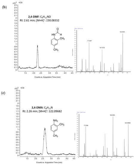 High-performance liquid chromatography-high resolution mass spectrometry (HPLC-HRMS) chromatograms of a honey sample spiked with (a) amitraz, (b) 2,4-DMF and (c) 2,4-DMA at 20 ng/g (corresponding to amitraz MRL/10).