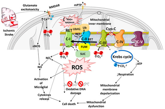 The first sign of an ischemic stroke is cerebral artery occlusion, which is followed by severe glucose and oxygen deprivation (OGD) and a number of pathological processes that ultimately result in irreversible brain damage and neuronal death [36]. Ischemic stroke may cause excessive accumulation of Ca2+ ions inside the mitochondria, which can lead to an imbalance of fission and fusion dynamics, mitochondrial dysfunction, mitochondrial-induced apoptosis, and mitophagy [37,38]. Indeed, a number of studies have demonstrated that mitochondrial dysfunction contributes to the pathology of ischemic stroke, which arises from the abnormal ROS production, calcium buildup, defective mitochondrial biogenesis, activation of apoptosis, disruption of ATP: ADP ratios, and reduction in NAD+ levels [39,40,41]. The mitochondrial dysfunction can trigger apoptosis by increasing the generation of ROS, calcium accumulation, and cytochrome c release [42]. Moreover, inflammatory responses may be activated during ischemic stroke, mediated by the NOD-like receptor protein 3 (NLRP3)-inflammasome [43,44]. As a result of OGD and cerebral IR injury, mitochondrial dysfunction has been demonstrated to be pivotal in the activation of the NLRP3 inflammasome in microglia. According to one study, mitochondrial dysfunction caused by the opening of the mitochondrial permeability transition pore (MPTP) resulted in an increase in ROS generation, which facilitated the activation of the NLRP3 inflammasome that is linked to abnormal mitochondrial fusion and fission events [45,46]. Mitochondrial dysfunction during stroke is also associated with multiple proteomic changes present in complex I proteins (e.g., NDUFS3, V1, V2, S1, S2). Such changes also occur during aging and age-related neurodegeneration [47], and may be responsible for RET and RET-ROS production during ischemic reperfusion (see later). Mitochondrial complex I, the first protein complex of the mitochondrial respiratory chain (MRC) that is also known as NADH dehydrogenase, is potentially involved in various neurodegenerative disorders through excessive ROS generation and modulating membrane polarization [48,49]. Though succinate dehydrogenase (complex II) is less involved in MRC defects during ischemia, it, nevertheless, also plays a role in the induction of ROS production and apoptotic cell death [17,50]. Such apoptotic pathways are characterized by intrinsic and extrinsic pathways of mitochondrial events during ischemic injury, e.g., loss of mitochondrial membrane potential, modifications of MRC, cytochrome c release, and impaired cellular redox state or abnormal antioxidative defense mechanism [51].