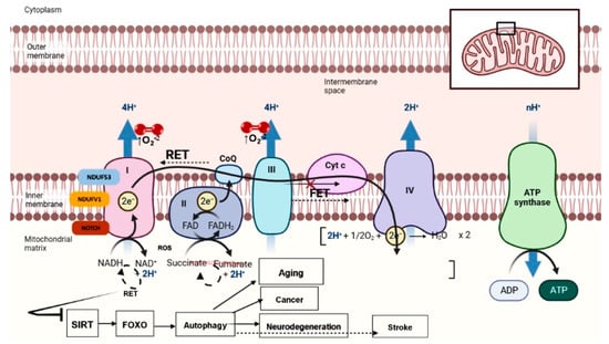 Mitochondria are critical for NADH/NAD+ metabolism. During the TCA cycle, NAD+ gains two electrons and a proton to be reduced to NADH. NADH is in turn oxidized to NAD+ upon donating electrons to NADH dehydrogenase (complex I) of the ETC. The central roles of NAD+ and NADH in TCA and ETC, respectively, underscore the importance of balanced NAD+/NADH to mitochondrial function [97]. Beyond this central metabolic function, NAD+ critically regulates the activities of NAD+-consuming enzymes, including sirtuins, poly-ADP-ribose polymerases, and CD38/157 ectoenzymes, which have been implicated in the aging process [98,99,100,101] NAD+/sirtuin modulates longevity through the activation of mitochondrial stress responses such as the unfolded protein response (UPRmt) and the nuclear translocation and activation of the FOXO transcription factor [102], providing a molecular link between mitochondrial stress signaling and longevity. It has been shown that the NAD+ level declines with age [102,103,104], and that replenishing NAD+ with a NAD+ precursor offers beneficial effects towards aging and age-related disorders [105]. However, the causes of NAD+ depletion during aging are not well-defined. The activation of RET is emerging as a key mechanism of NAD+ depletion and the attenuation of NAD+-regulated lifespan regulatory activities during aging. Indeed, the lifespan extension by CPT-mediated RET inhibition is dependent on the sirtuin/FOXO/autophagy pathway [47] (Figure 2). It will be exciting to test if the sirtuin/FOXO/autophagy pathway is also involved in the beneficial effects of RET inhibition in ischemic stroke and other disease settings where mitochondrial complex I has been implicated.