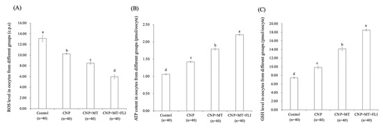 3.4. Effect of the Combination Treatment of CNP, MT, and FLI on ROS, ATP, and GSH Levels in Bovine Oocytes