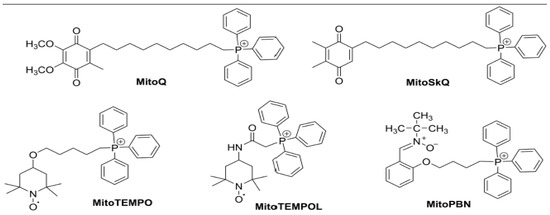 Chemical structures of TPP-linked mitochondrial-targeted antioxidants MitoQ, SkQ1, Mito-TEMO, MITO-TEMPOL and Mito-PBN.