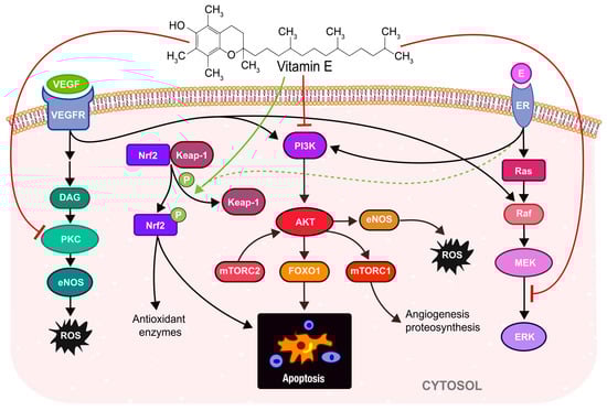 Vitamin E (tocopherol) action in response to oxidative stress. It can stimulate Nrf2 (Nuclear factor erythroid 2–related factor 2) signaling (green arrow) and cell apoptosis. Tocopherol can affect signaling of growth factors (Vascular Endothelial Growth factor, VEGF) and hormones (estrogen, E) by inhibition of PKC (Protein kinase C) (red line), which activates protein phosphatase, and dephophorylates PKC and inhibits its activity, which in turn leads to lower ROS mediated via uncoupled eNOS. Tocopherol also suppress E-dependent ERK activation (red line) via its ability to bind to the estrogen receptor (ER). On the other hand, vitamin E can inhibit apoptosis through the PI3K/AKT/mTOR pathway (red line). (VEGFR—Vascularendothelial Growth Factor Receptor, DAG—Diacylglycerol, Keap-1—Kelch-like ECH-associated Protein 1, P—phosphate, PI3K—Phosphoinositide 3-kinase, AKT—Protein kinase B (PKB) also known as AKT, FOXO1—Forkhead box protein O1, mTORC1—mammalian Target of Rapamycin Complex 1, mTORC2—mammalian Target of Rapamycin Complex 2, eNOS—endothelial NOS, Ras—Rat sarcoma virus, Raf—Rapidly accelerated fibrosarcoma, MEK—Mitogen-activated protein kinase, ERK—Extracellular signal-regulated kinase).