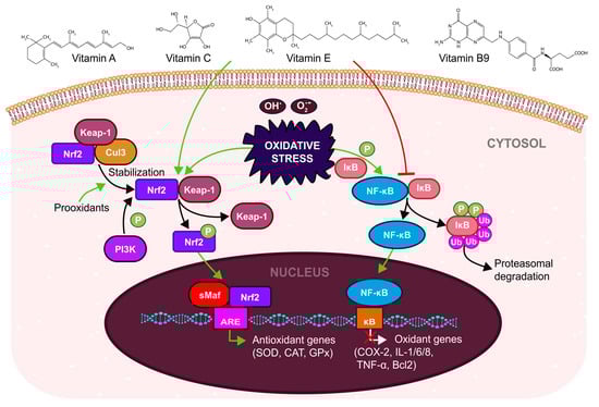 A summary of vitamin A-C-E-B9 action in the activation (green arrows) of Nrf2 signaling and suppression (red line) of NF-κB signaling. (Nrf2—Nuclear factor erythroid 2–related factor 2, Keap-1—Kelch-like ECH—associated Protein 1, Cul3—cullin protein 3, P—phosphate, NF-κB—Nuclear factor kappa-light-chain-enhancer of activated B cells, IκB—inhibitor of nuclear factor kappa B, sMaf—musculoaponeurotic fibrosarcoma, ARE—Antioxidant responsive element, κB—κB DNA binding, SOD—Superoxide dismutase, CAT—Catalase, GPx—Glutathione peroxidase, COX-2—Cyclooxygenase 2, IL-1/6/8—Interleutkin 1/6/8, TNF-α—Tumor necrosis factor α, Bcl2—B-cell lymphoma-2).