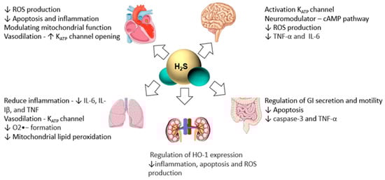 Understanding the physiological roles of gaseous mediators such as hydrogen sulfide (H2S) has been the focus of the past two decades of active research (for reviews, see [1,2,3,4]). It is now known that animals, plants, fungi, and bacteria naturally produce H2S and use this molecule in a range of biochemical and physiological processes [5]. In mammalian systems, H2S acts in cells and tissues and plays roles in mitochondrial function and homeostasis [6], cryoprotection [7], cellular antioxidant function [8], inflammation and inflammatory signaling [9], and tissue repair and wound healing [10]. Other research has shown important functions in the cardiovascular system [11,12]; the brain [13], kidney [14], and bladder [15]; the digestive [16] and urogenital tracts [17]; the respiratory and reproductive systems, such as erectile function [18,19,20]; obesity [21]; longevity and aging-related diseases [22]; fundamental cellular processes such as the cell cycle and apoptosis [23,24]; and the induction of signaling cascades such as p53, NF-κB, and Nrf2 [25,26,27] (summarized in Figure 1).
