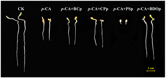 The phenotypes of tomato seeds at 7 days of germination under different treatments. Abbreviations: CK, control check with ddH2O; p-CA, stress treatment with 10 mL 400 mg/L p-coumaric acid; p-CA + BCP, 10 mL 400 mg/L p-coumaric acid with 0.0250 g biochar particles; p-CA + CPP, 10 mL 400 mg/L p-coumaric acid with 0.0027 g calcium peroxide particles; p-CA + PSP, 10 mL 400 mg/L p-coumaric acid with 0.0098 g potassium persulfate particles; p-CA + BODP, 10 mL 400 mg/L p-coumaric acid with 0.0375 g of biochar-dual oxidant particles.