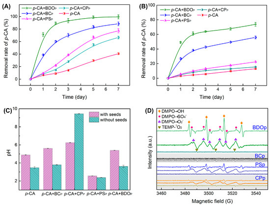 Evolution of the p-CA removal rate was determined under different treatments with tomato seeds (A) and without seeds (B). The pH value of the solution was measured under different treatments on the 7th day after culture (C). Results presented as the mean ± SD (n = 4). (D) Electron paramagnetic resonance (EPR) spectra of reactive oxidizers with DMPO and TEMP after 10.0 min of reaction (Reaction conditions: 10 mL 400 mg/L p-CA; amount for BDO, BC, PS, and CP particles were 0.0375, 0.0250, 0.0098, and 0.0027 g, respectively; reaction temperature was 25 °C). Treatment abbreviations: CK, control check with ddH2O; p-CA, p-coumaric acid stress treatment; p-CA + BCP, p-coumaric acid with biochar particles; p-CA + CPP, p-coumaric acid with calcium peroxide particles; p-CA + PSP, p-coumaric acid with potassium persulfate particles; p-CA + BODP, p-coumaric acid with biochar-dual oxidant particles.