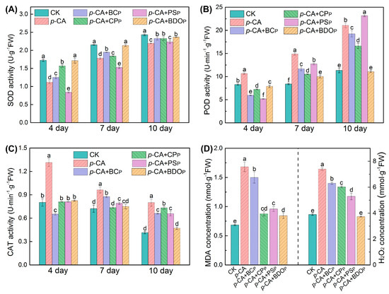 Effects of various treatments on the enzymatic activities of superoxide dismutase (SOD) (A), peroxidase (POD) (B), and catalase (CAT) (C) in tomato seed radicals. The contents of malondialdehyde (MDA) and H2O2 were measured in tomato seed radicals on the 7th day of culture (D). Treatment abbreviations: CK, control check with ddH2O; p-CA, stress treatment with 10 mL 400 mg/L p-coumaric acid; p-CA + BCP, p-coumaric acid with biochar particles; p-CA + CPP, p-coumaric acid with calcium peroxide particles; p-CA + PSP, p-coumaric acid with potassium persulfate particles; p-CA + BODP, p-coumaric acid with biochar-dual oxidant particles. Bars represent mean ± SD (n = 4). Different letters indicate significant statistical differences between treatments (One-way ANOVA, LSD test, p < 0.05).
