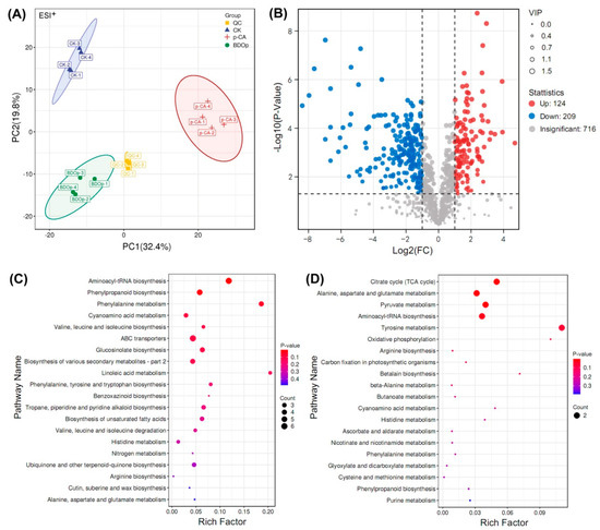 Principal component analysis of all detected metabolites in different treatment groups under positive (ESI+) ion mode (A). (QC: quality control; CK: ddH2O control group; p-CA: treatment group with 10 mL 400 mg/L p-coumaric acid; BDOp: p-coumaric acid with biochar-dual oxidant particles. Each treatment was subjected to four biological replicates). Volcano map of metabolites in CK vs. p-CA group (B). The bubble diagram for the top 20 significantly enriched KEGG pathways of the 224 (165 up- and 59 down-regulated) differentially accumulated metabolites (DAMs) in response to the p-CA stress (C) and 44 (19 up- and 25 down-regulated) DAMs specifically regulated by the BDO composite particles (D).