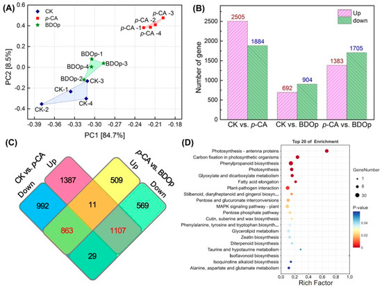 Principal component analysis (PCA) (A) of FPKM profiles in three treatment groups; The statistics of the up- and down-regulated DEGs in pairwise comparison of treatments (B). Venn diagram of the number of up-regulated and down-regulated DEGs in CK vs. p-CA and p-CA vs. BDOp pairwise comparison (C). The bubble diagrams for the top 20 KEGG pathways for 1107 up-regulated differentially expressed genes (DEGs) in CK vs. p-CA group (D). (CK: ddH2O control group; p-CA: treatment group with 10 mL 400 mg/L p-coumaric acid; BDOp: p-coumaric acid with biochar-dual oxidant particles. Each treatment was subjected to four biological replicates).