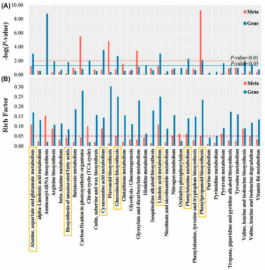 The −logP-value (A) and rich factor (B) correspond to the KEGG pathway enriched by differentially expressed genes (DEGs) and differentially accumulated metabolites (DAMs). The yellow rectangle depicts seven co-enriched metabolic pathways of concern.
