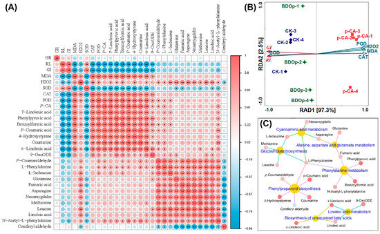 Heatmap analysis between germination indices, antioxidant indices, and 20 differentially accumulated metabolites (DAMs) (A). Redundancy analysis of germination indexes and antioxidant index (B). Metabolite network for the 20 DAMs in KEGG enriched pathways (C). Abbreviations: RL, radical length; GI, germination index; SOD, superoxide dismutase; POD, peroxidase; CAT, catalase; MDA, malondialdehyde; CK, ddH2O control group; p-CA, treatment group with 10 mL 400 mg/L p-coumaric acid; BDOp, p-coumaric acid with biochar-dual oxidant particles. * p < 0.05 and ** p < 0.01.
