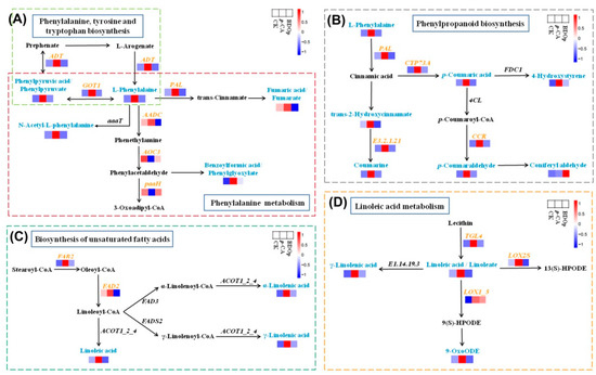 Integrated metabolomics and transcriptomics analyses were performed. Notably, 33 KEGG pathways were shared between transcripts and metabolites, among which the phenylpropanoid biosynthesis pathway was significantly enriched (p-value < 0.01) (Figure 6). In addition, there were five common enrichment metabolic pathways with rich factors of both transcriptomics and metabolomics greater than 0.05, and a p-value of transcriptomics or metabolomics less than 0.01, they were alanine, aspartate and glutamate metabolism, cyanoamino acid metabolism, glucosinolate biosynthesis, linoleic acid metabolism, and phenylalanine metabolism. Considering the unique significance of unsaturated fatty acids in plant stress tolerance, the biosynthesis of the unsaturated fatty acids pathway was also a concern.