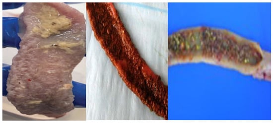 Necrotic enteritis (NE) is caused by mainly by Clostridium perfringens (CP) and typically occurs in broiler chickens between 2 to 6 weeks of age. NE pathogenesis is mainly attributed to the production of tissue-degrading toxins: NetB (major toxin), alpha (α)-toxin and TpeL by CP [91]. Clinical NE is characterized by high mortality in poultry, while subclinical NE (SNE), which is becoming more prevalent, is mainly characterized by intestinal mucosal damage without clinical signs or mortality [92]. Intestinal damage which reflects necrotic enteritis is presented in Figure 1.