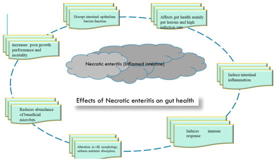 The vulnerability of chickens to oxidative stress is a key problem in the current intensive poultry industry, and oxidative stress acts as a driver for pathogenesis in animals. Diseases as stressors have been reported to distort the redox balance of the gut [16]. Broiler production is often associated with the high incidence of diseases such as necrotic enteritis which are caused mainly by C. perfringens, Salmonella, E coli, and Eimeria spp., accounting for huge economic losses due to retreaded growth performance [17,18,19] and high mortality rate [20,21,22,23] accruing from the diseases. The severity of necrotic enteritis disease occurs mainly in the gut, causing intestinal epithelial damage and disrupted physiological functions of the gut; reduced immunity and high immune response [24,25]; decreased antioxidant capacity [14]; increased intestinal inflammation [26,27,28]; impaired intestinal barrier function [15,29]; alterations in villi morphology [13,27]; gut lesions [30,31,32]; and microbial dysbiosis [11,15,33], which ultimately impairs nutrient absorption and utilization. The control of gut-infection-induced oxidative stress and the utilization of gut enhancers to augment the resistance capacity of the host has become expedient. In the past, antibiotics have been utilized to promote gut health, but issues arising from bacterial resistance, detrimental environmental impacts and the safety of animal products in the food chain [34] renders it an obsolete therapeutic agent.