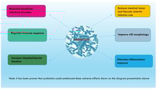 The utilization of microbial-based therapy potentiates ameliorating effects on NE-challenged broilers with better economic benefits [152]. The use of probiotics aims to improve intestinal integrity and overall gut health in disease-challenged broiler birds and increase the recovery rate for enhanced growth performance and reductions in economic losses. The probiotics’ mitigative effect could be through various mechanisms: reductions in gut colonization by pathogens and gut lesion, the regulation of intestinal inflammation, the protective effect on intestinal epithelial barrier integrity and villi structure, improved immunity and the alteration of gut microbial composition in favor of beneficial microbes. These positive effects hinge on antimicrobial and toxin detoxifying effects due to the synthesis of SCFAs and bacteriocins, the suppression of proinflammatory cytokines and the increased production of anti-inflammatory factors, the modulation of tight junction proteins’ expression and structure and villi development via the suppression of the apoptosis of intestinal epithelial cells. Various mechanisms by which probiotics promote gut health in NE-challenged birds are presented in Figure 3.