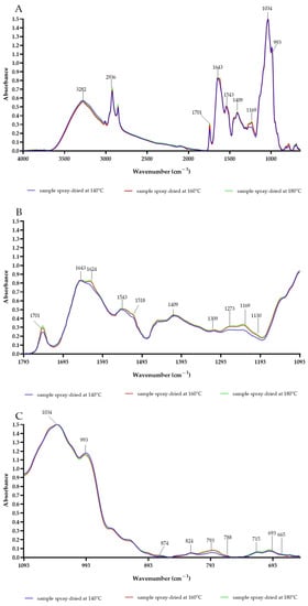 2.5. Determination of Sulfhydryl Groups (–SH) and Disulfide Bonds (–S–S–) Contents in Spray-Dried Powders