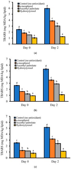 The results presented in Figure 5 show that the antioxidants were able to suppress MDA formation in the seafood during frying (day 0) compared to the control. As shown, the most effective antioxidant was hydroxytyrosol, while ascorbyl palmitate performed slightly better than α-tocopherol in all the seafood. After two days of refrigerated storage, the TBARS values in the control had doubled the day 0 values, indicating rapid oxidation of omega-3 lipids in the seafood and the absorbed SFO. Similar doubling trends were found with the α-tocopherol and ascorbyl palmitate-treated samples, although they had lower TBARS values than the control samples. A previous study found an increase in MDA formation in fish crackers fried at 170 °C for 1 min in a tocopherol-rich soybean oil. The authors attributed this to the degradation of tocopherol during deep-fat frying [36]. Meanwhile, with hydroxytyrosol, a small increase in TBARS (<0.35 mg MDA/kg lipid) was observed in each seafood from day 0 to day 2, showing the effectiveness of this antioxidant in suppressing MDA formation in fried seafood during refrigerated storage. These results agree with previous studies showing that hydroxytyrosol could inhibit MDA formation in different PUFA-enriched meat products during chilling storage [37,38].