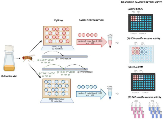 Samples of whole-body homogenates were collected at 13:00 and 19:00 in triplicate for control samples. Experimental samples were collected at the same time as the control in triplicate, 6 h after one 75 μg vCOC or two 75 μg vCOC exposures (Figure 1). Heads of flies fed cocaine and controls were collected at 09:00, 24 or 48 h after feeding on the media containing the supplement. Flies were frozen and then decapitated using manual dissection. For whole body homogenates we used 5 adult flies, and for head homogenate approximately 32 heads. Samples were prepared using lysis buffer consisting of 1 × phosphate-buffered saline (1 × PBS) at pH 7.4 in the presence of 0.1% (v/v) Triton X-100 (Sigma Aldrich, Zwijndrecht, The Netherlands). The volume of extraction buffer was determined as the proportion of 300 µL of buffer and 5mg tissue sample. NaCl, KCl, Na2HPO4, and KH2PO4, were of analytical grade. After mechanical homogenization, samples were incubated in an ice bath for 20 min and centrifuged at 14,000 rpm for 30 min at 4 °C. Supernatants were taken for biochemical assays (Figure 1). We measured the specific enzyme activity of superoxide dismutase (SOD) and catalase (CAT), and total ROS and H2O2 amount with fluorescent redox sensitive dyes, 2′,7′-dichlorofluorescein (DCF) and dihydroethidium. (DHE) in the whole body homogenates. Fluorescent advanced end glycation products (fAGEs) were measured in the whole body and head homogenates. From the head homogenates we have measured only H2O2 amount using DHE.