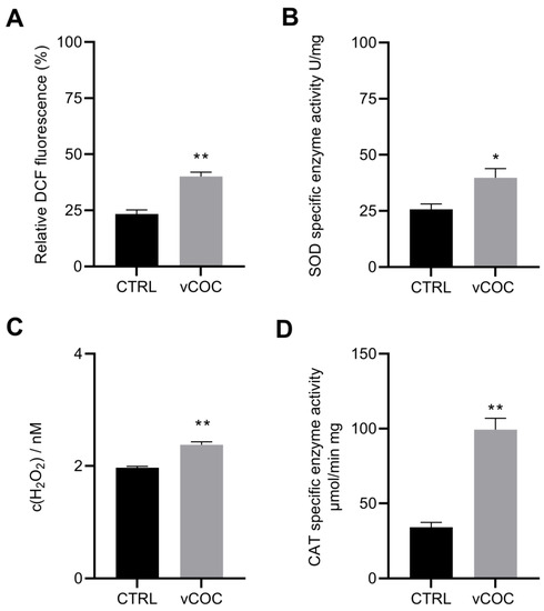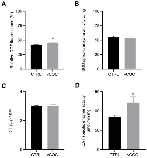 A single dose of vCOC did not affect the specific enzymatic activity of SOD (Figure 2.B), but it significantly increased the activity of CAT (Figure 2D) compared to the untreated control. ROS measured as a change in the relative fluoresce units (RFU) increased in vCOC exposed flies (Figure 2A), while there was no change in the H2O2 concentration (Figure 2C).