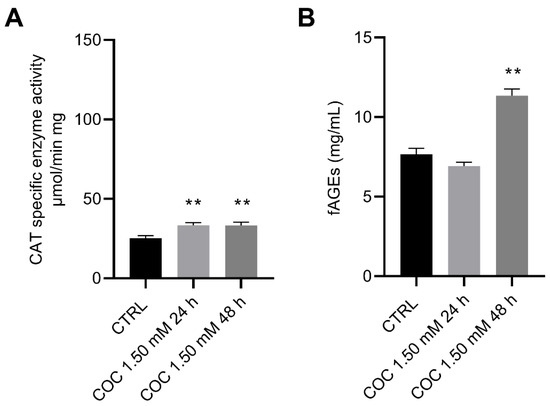 Oral feeding of cocaine leads to an increase in CAT activity and accumulation of fAGE. Male flies were fed either 1.50 mM cocaine (COC) for 24 or 48 h or left untreated, control (CTRL). Whole body homogenates were prepared at 09:00. (A) Catalase (CAT) specific enzyme activity. (B) Fluorescent advanced end glycation products (fAGEs) concentration determined using calibration curve for standard calibrator fAGEs-BSA (bovine serum albumin). All measurements were performed in triplicate (n = 9). **: p < 0.01 using one-way ANOVA with Tukey’s multiple comparison post-hoc test.