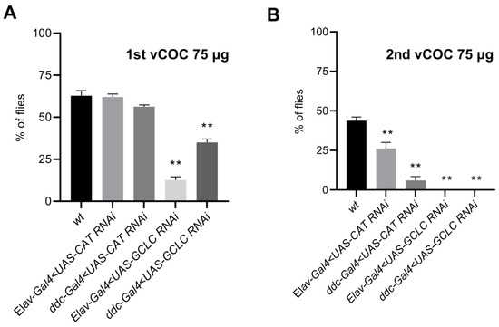Main driver lines Elav-Gal4 and ddc-Gal4 and UAS-lines carrying RNAi constructs for CAT and GCLC show sensitivity and locomotor sensitization to vCOC similar to wt. (A) Percent of individual flies that increased locomotor activity relative to baseline activity after single exposure to 75 μg vCOC at 09:00 (sensitivity). (B) Percent of individual flies that increased locomotor activity relative to baseline activity after single exposure at 09:00 and further increased activity after second exposure at 15:00 to 75 μg vCOC (locomotor sensitization). Data show one replica (n = 32).