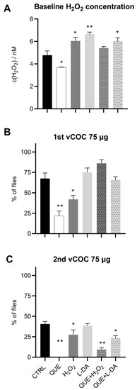 Because the antioxidant feeding attenuated vCOC-induced behaviors, we postulated that increasing the amount of H2O2 will have the opposite effect. Thus, we fed flies 130 mM H2O2 for 24 h before vCOC exposure. As expected, this significantly increased the amount of H2O2 in in the head homogenates (Figure 6A), but the behavioral effect was similar to the QUE feed flies. Both, the sensitivity and locomotor sensitization were significantly reduced (Figure 6B,C), although the change was less pronounced than in QUE alone (Figure 6C). This shows that removal, as well as excess of H2O2 affects the development of locomotor sensitization.