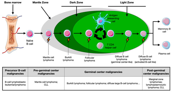 - Basso, K.; Dalla-Favera, R. Germinal centres and B cell lymphomagenesis. Nat. Rev. Immunol. 2015, 15, 172. [Google Scholar] [PubMed]