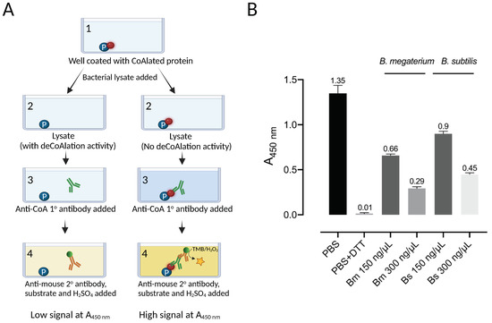 3.1. Protein deCoAlation Activity Is Detected in B. megaterium and B. subtilis Lysates by Using an ELISA-Based deCoAlation Assay