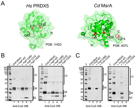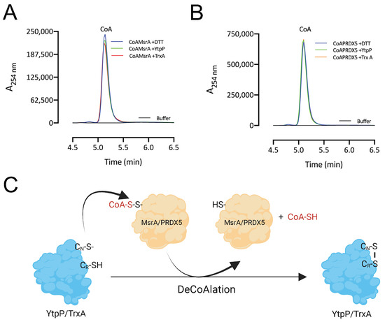 3.4. B. subtilis YtpP and TrxA deCoAlate CoA–PRDX5 and CoA–MsrA