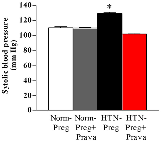 Systolic blood pressure measured in Norm-Preg, Norm-Preg + Prava, HTN-Preg, and HTN-Preg + Prava groups. Values represent mean ± SEM. * p < 0.05 vs. Norm-Preg group.