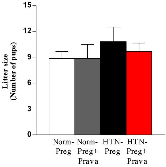 Litter size recorded in Norm-Preg, Norm-Preg + Prava, HTN-Preg, and HTN-Preg + Prava groups. Values represent mean ± SEM.