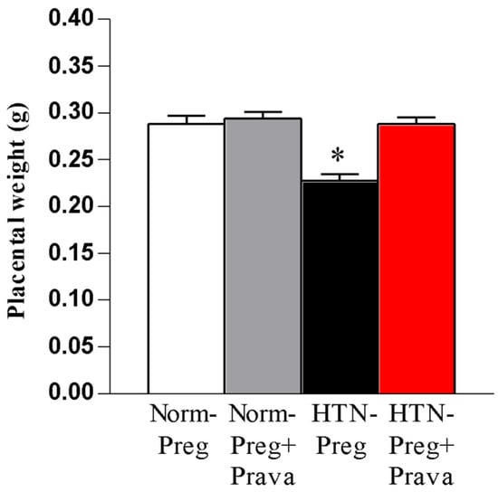 Placental weights recorded in Norm-Preg, Norm-Preg + Prava, HTN-Preg, and HTN-Preg + Prava groups. Values represent mean ± SEM. * p < 0.05 vs. Norm-Preg group.