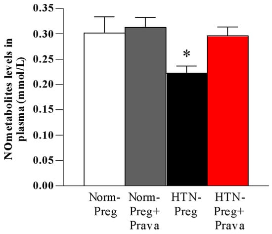 Plasma levels of NO metabolites determined in Norm-Preg, Norm-Preg + Prava, HTN-Preg, and HTN-Preg + Prava groups. Values represent mean ± SEM. * p < 0.05 vs. Norm-Preg group.