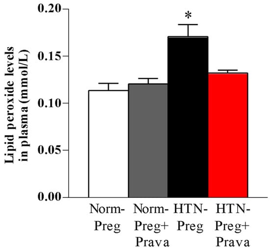 Lipid peroxide levels in plasma determined in Norm-Preg, Norm-Preg + Prava, HTN-Preg, and HTN-Preg + Prava groups. Values represent mean ± SEM. * p < 0.05 vs. Norm-Preg group.