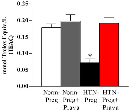The Trolox equivalent antioxidant capacity (TEAC) in plasma determined in Norm-Preg, Norm-Preg + Prava, HTN-Preg, and HTN-Preg + Prava groups. Values represent mean ± SEM. * p < 0.05 vs. Norm-Preg group.