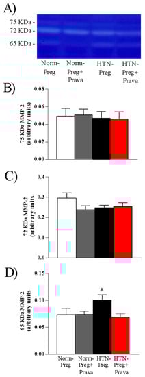 Representative zymography gel of placenta (A), gelatinolytic activities of 75 Kda MMP-2 (B), 72 Kda MMP-2 (C), and 65 KDa MMP-2 (D) of Norm-Preg, Norm-Preg + Prava, HTN-Preg, and HTN-Preg + Prava groups. Values represent mean ± SEM. * p < 0.05 vs. Norm-Preg group.