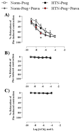 Acetylcholine (ACh)–induced relaxation (%) after precontraction with phenylephrine (Phe) in aortas with endothelium (A), aortas without endothelium (B), and aortas with endothelium and incubated with NO synthase inhibitor, L-NAME (C) of Norm-Preg, Norm-Preg + Prava, HTN-Preg, and HTN-Preg + Prava groups. Values represent mean ± SEM. * p < 0.05 vs. Norm-Preg and HTN-Preg.