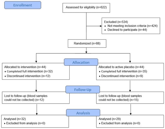 Fasting blood samples for vitamin C analysis were collected into heparin tubes and rapidly processed for stable storage at −80 °C [33]. These samples were analysed in bulk at the end of the study intervention period using high-performance liquid chromatography (HPLC) as described previously [34]; one baseline blood sample was not able to be obtained (n = 60). The reference range for vitamin C is 26–85 µmol/L, with relevant thresholds being ≤11 µmol/L (deficiency), ≤23 µmol/L (hypovitaminosis C), ≥50 µmol/L (adequate), and ≥70 µmol/L (saturating).