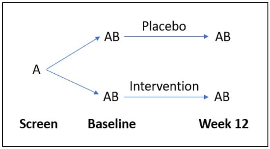 Participants were randomly allocated (1:1) to receive either a broad-spectrum multinutrient formula (Daily Essential Nutrients supplied by Hardy Nutritionals) or an active control formula containing iodine and riboflavin for a 12-week period (Figure 2). The full daily dose of 12 capsules was taken as four capsules three times daily. The complete list of intervention ingredients is available from the published study protocol [24]. Each capsule contained 50 mg of vitamin C (as ascorbic acid); thus, the full dose of 12 capsules comprised 600 mg of vitamin C daily.